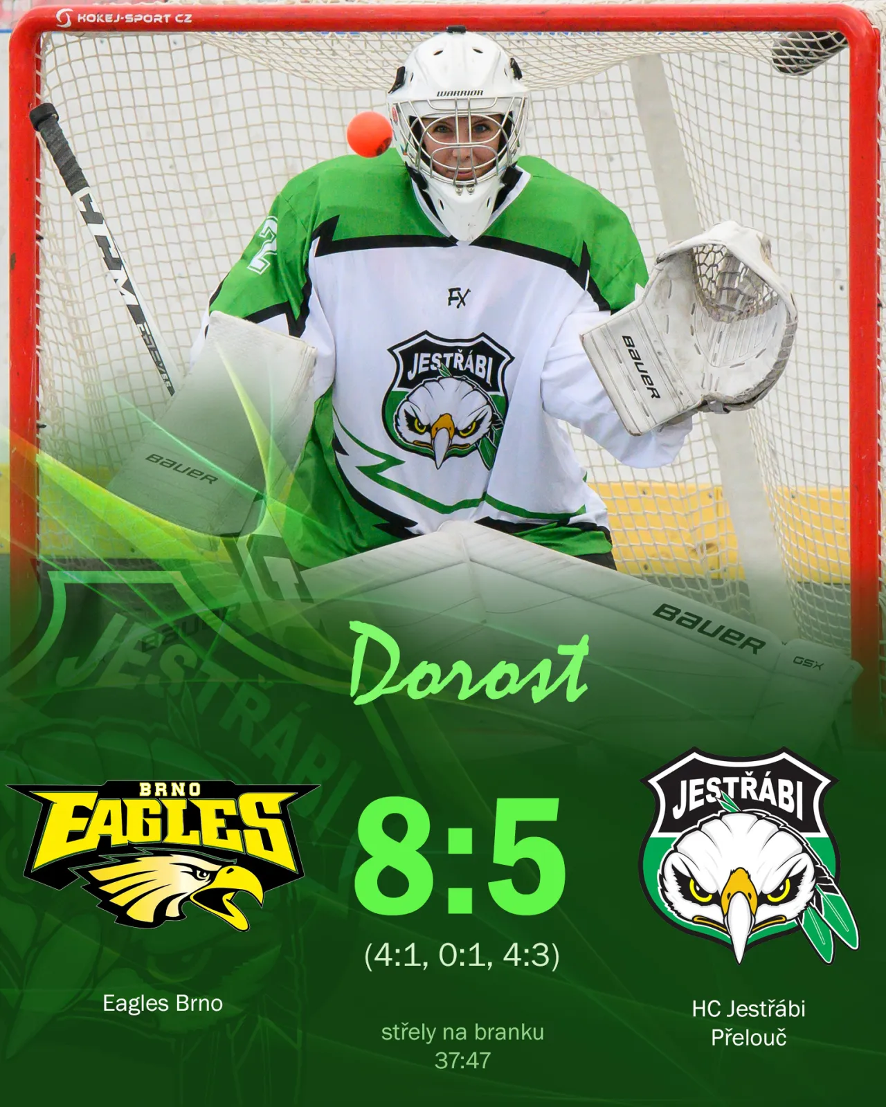 Zápas extraligy proti Eagles Brno měl na programu v sobotu 1. 11. náš dorostenecký tým a byl také jediným týmem Jestřábů, který byl o minulém víkendu v akci. I když jsme byli střelecky aktivnější a v zápase tým vstřelil do sítě soupeře hned pět branek, tak na výhru to bohužel nakonec nestačilo.