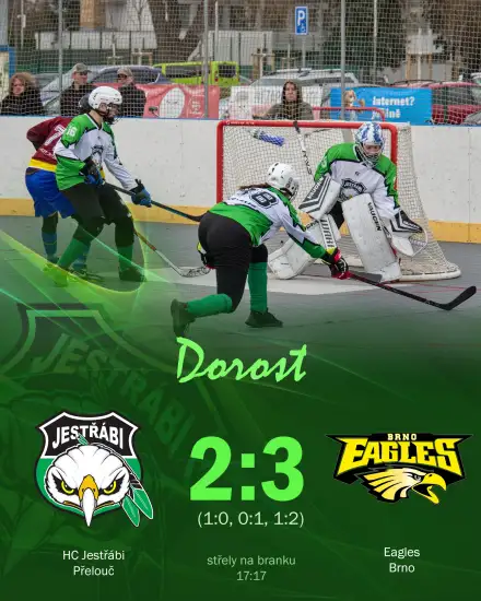 Dorostenci doma hostili Eagles Brno, tedy tabulkového souseda. Zápas jsme odehráli skvěle a po brankách Tadeáše Černého a Matyáše Tesaře jsme po dvou třetinách vedli 2:1 a živili naději na plný bodový zisk. Osudnými se nám stala dvě vyloučení ve 3. třetině, které Eagles dokázali potrestat. Na jejich vedoucí gól ve 43. minutě již Jestřábi reagovat bohužel nedokázali. I tak ale dorostu patří díky za předvedenou hru.